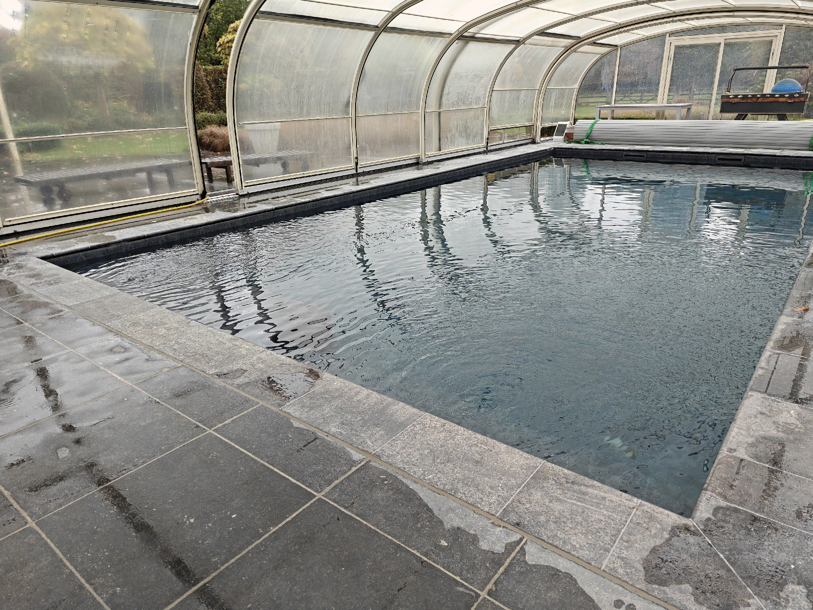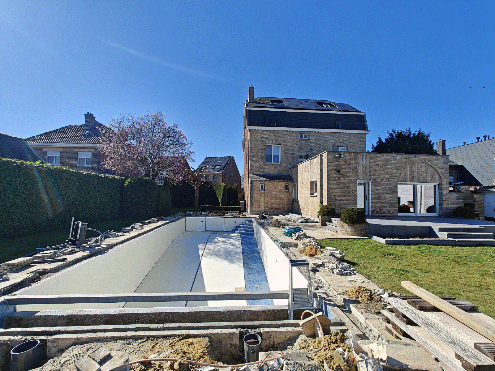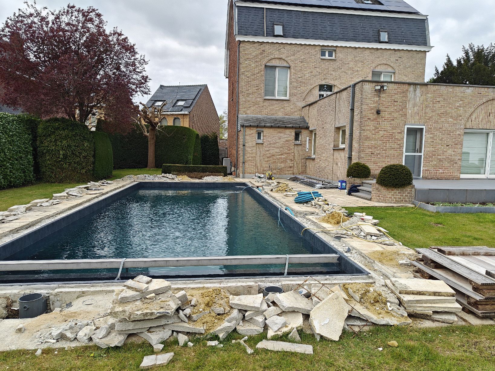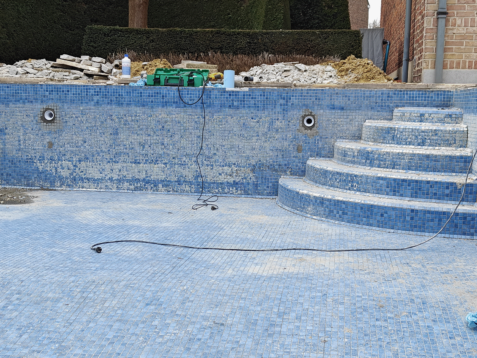 Mozaïek zwembad met waterverlies. Er is een volledige breuk over de betonnen vloer en deels muren, waardoor de kuip niet meer waterdicht is. Ook de mozaïek tegeltjes naast de breuken komen los. Mits zwembad 30 jaar oud is werd er besloten ook alle inbouwonderdelen in PVC te vervangen. Het PVC rolluik viel in brokken uit elkaar en diende (veiligheid kinderen en huisdieren) vervangen te worden. Ook werd er geopteerd om het zwembad te voorzien van een isolerende laag van 1,4mm dikte. De breuk in het beton liep door de bodemputten (2), waardoor besloten werd nieuwe wand bodemputten te installeren met een volledige nieuwe aansluiting tot aan het filterlokaal. Bijkomend: vervangen tegels omheen zwembad en nieuwe boordstenen.