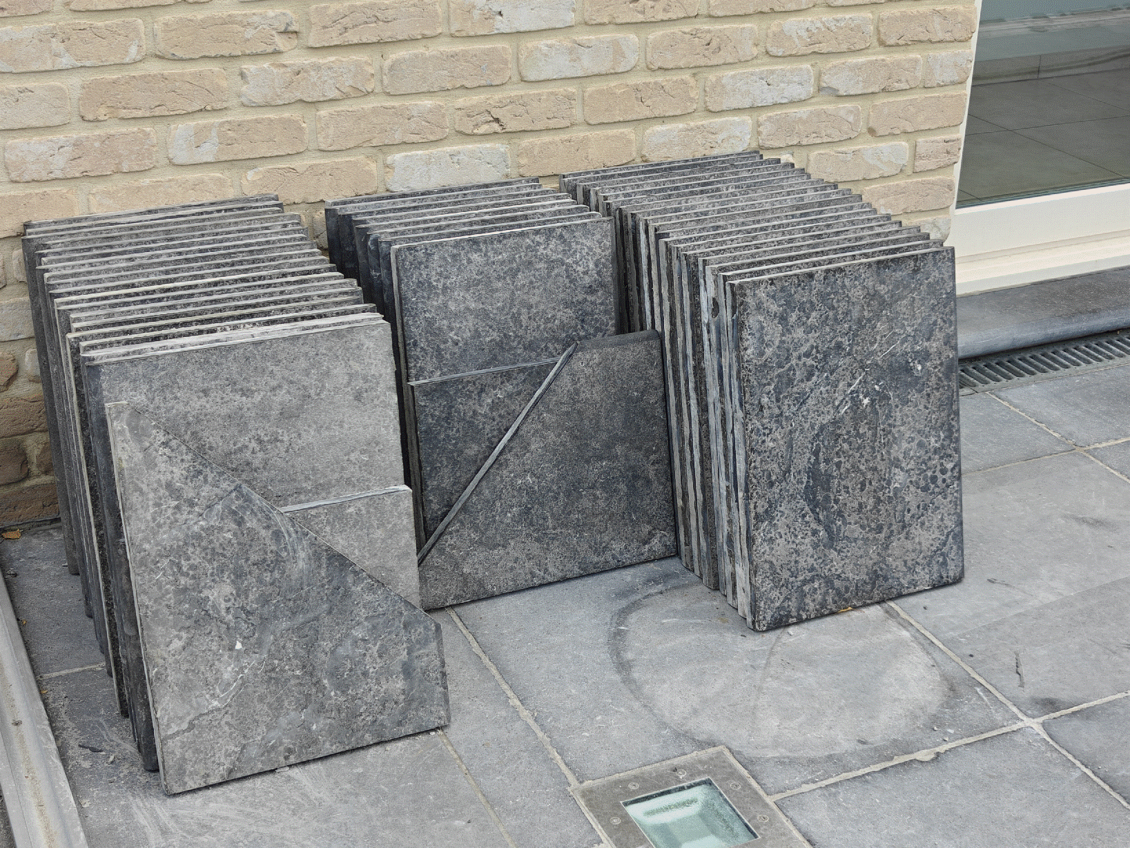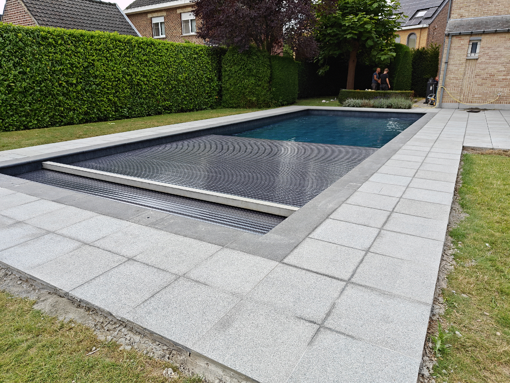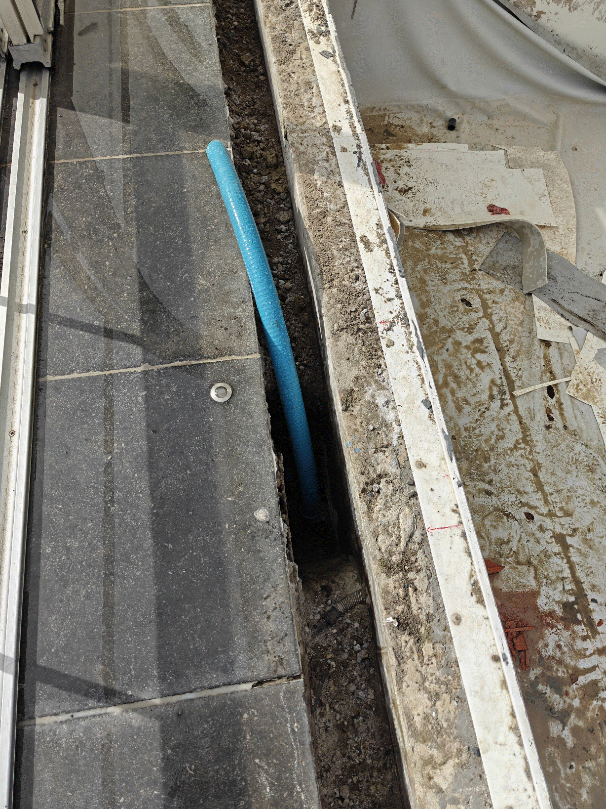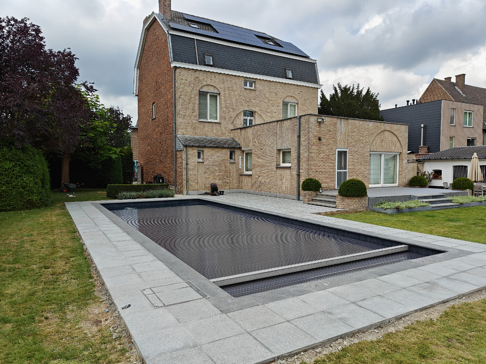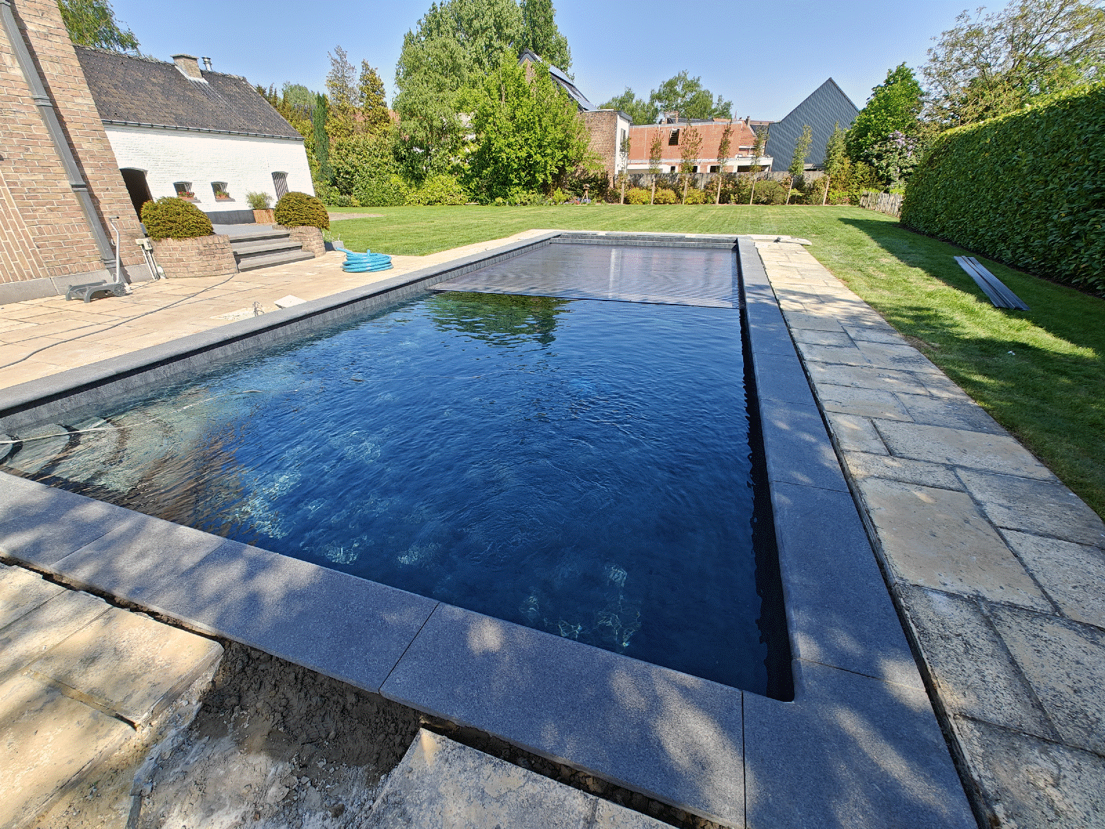Mozaïek zwembad met waterverlies. Er is een volledige breuk over de betonnen vloer en deels muren, waardoor de kuip niet meer waterdicht is. Ook de mozaïek tegeltjes naast de breuken komen los. Mits zwembad 30 jaar oud is werd er besloten ook alle inbouwonderdelen in PVC te vervangen. Het PVC rolluik viel in brokken uit elkaar en diende (veiligheid kinderen en huisdieren) vervangen te worden. Ook werd er geopteerd om het zwembad te voorzien van een isolerende laag van 1,4mm dikte. De breuk in het beton liep door de bodemputten (2), waardoor besloten werd nieuwe wand bodemputten te installeren met een volledige nieuwe aansluiting tot aan het filterlokaal. Bijkomend: vervangen tegels omheen zwembad en nieuwe boordstenen.