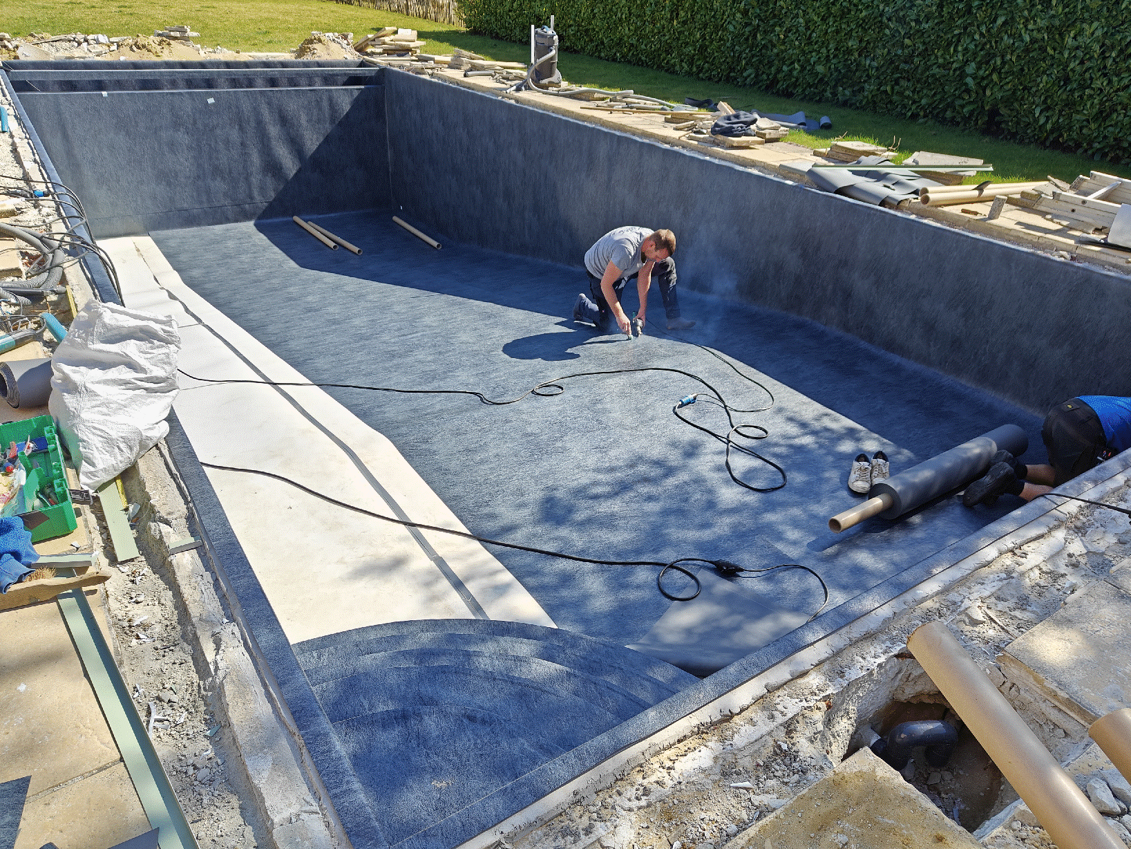 Ook werd het zwembad volledig voorzien van isolatieschuim 1,4mm. Nieuwe RGB lampen. Aanpassing skimmers in kleur dat bij nieuwe speciale liner zouden passen + nieuw ontsmetting systeem op basis van magnesium. Nieuwe liner : Alkor Touch Elegance 2mm dikte