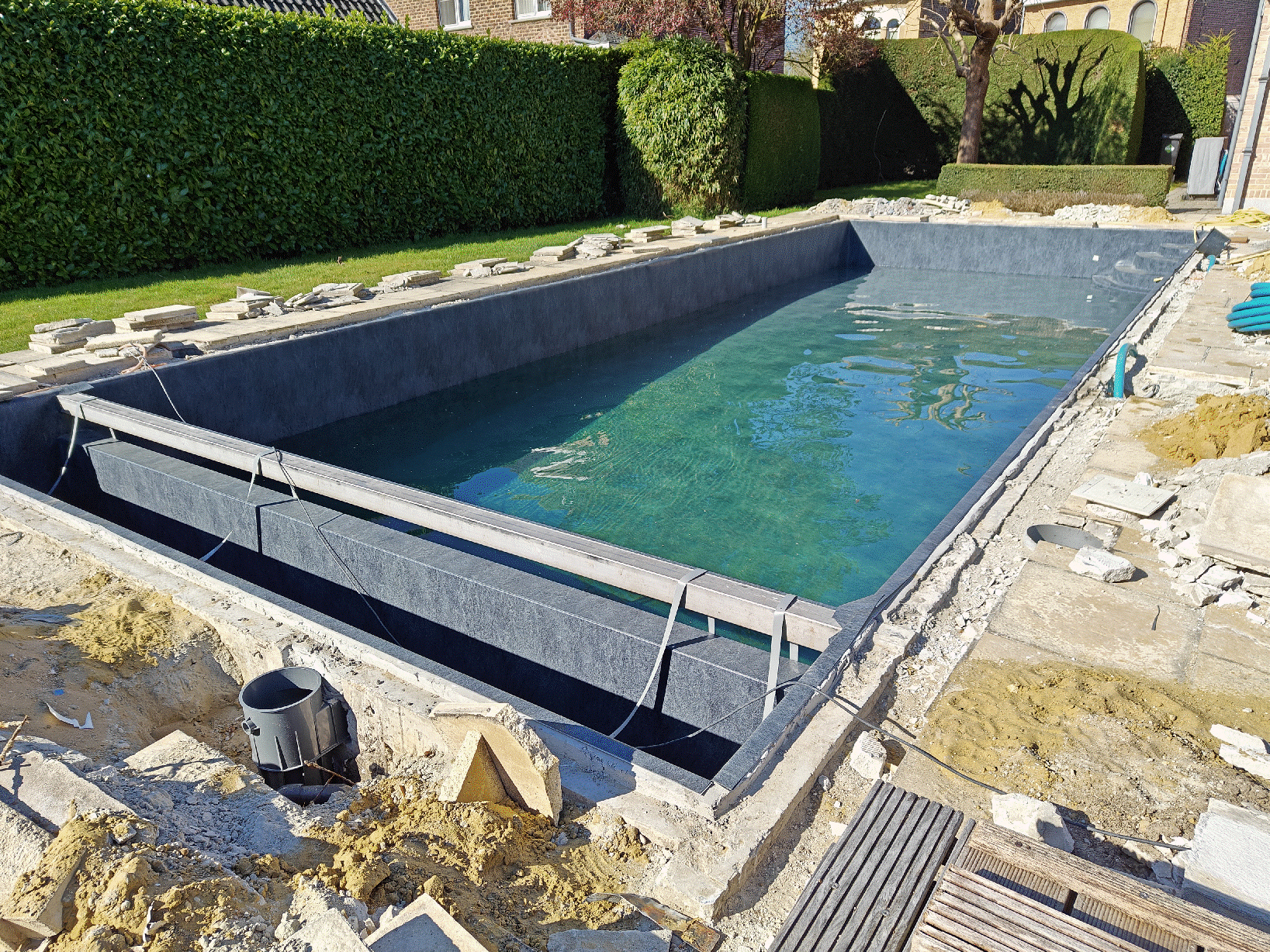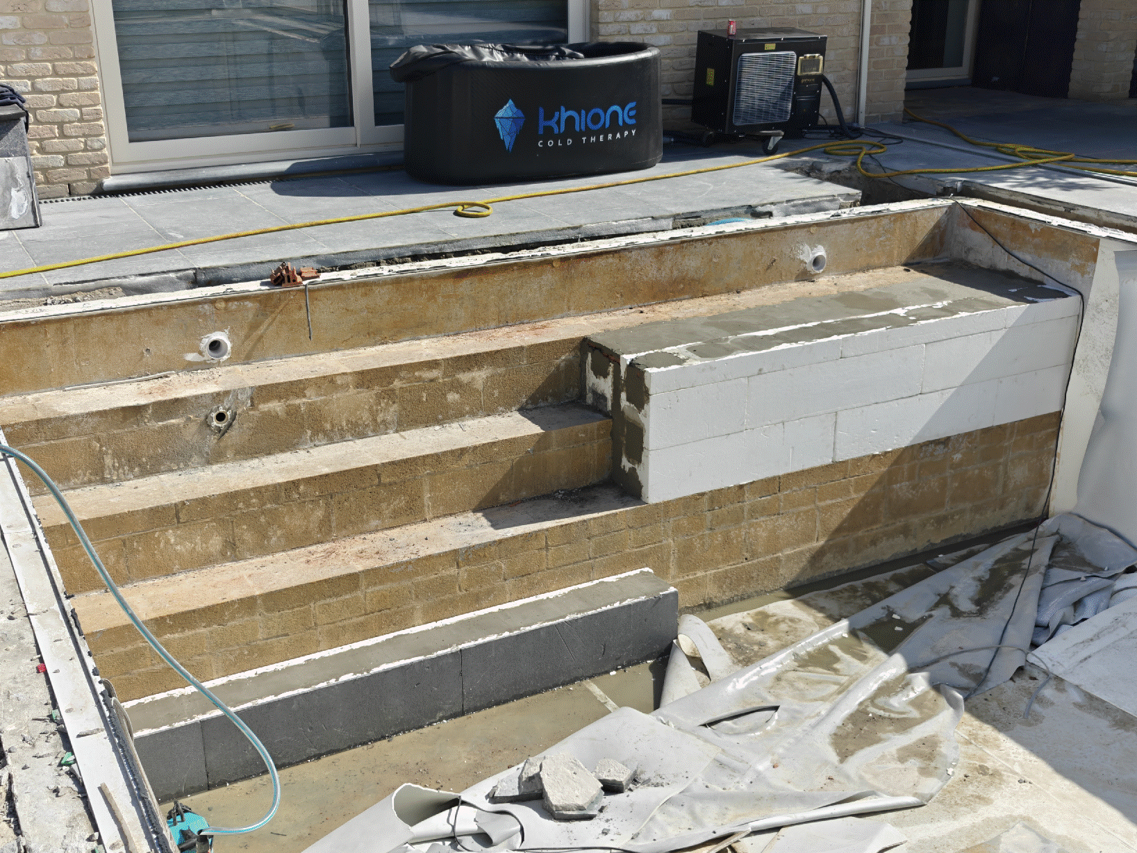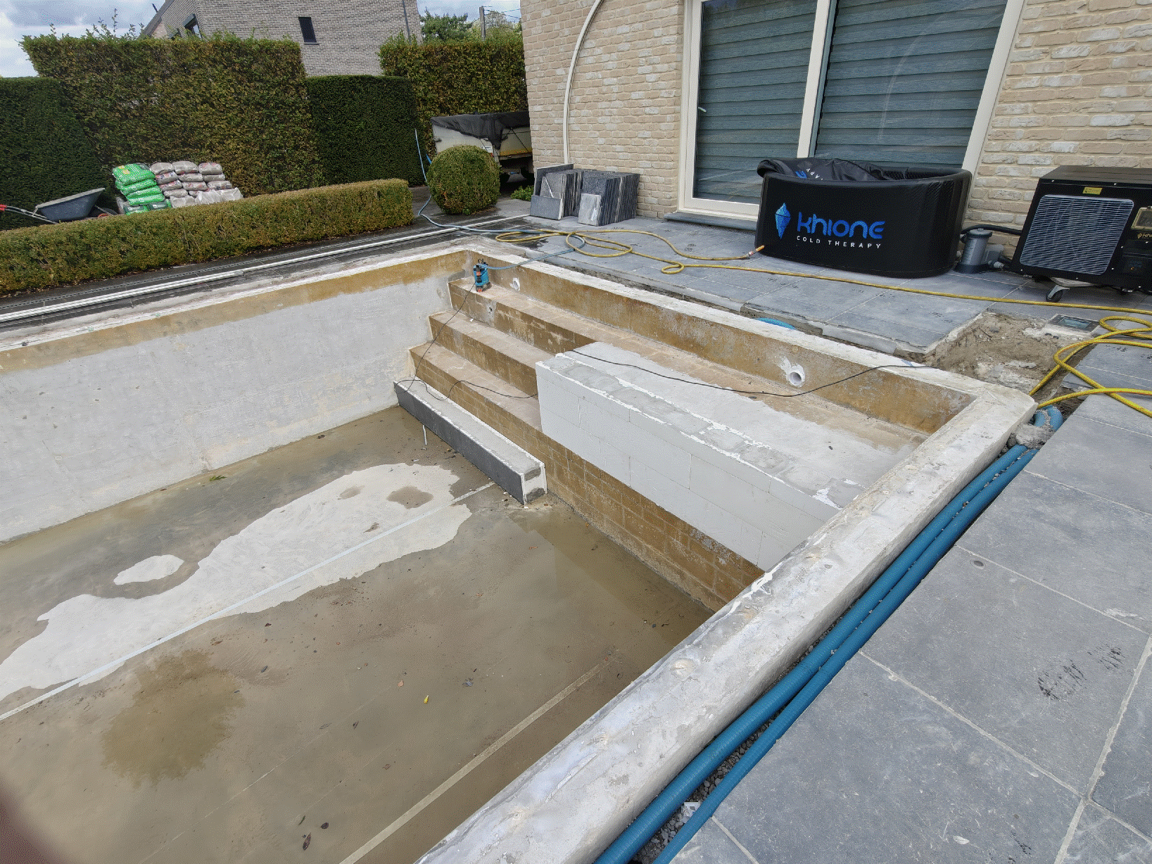 Veel plooien op de vloer en muren + water achter de dunne rekfolie (liner 0,7mm). Zulke liners nooit gebruiken indien er zeer hoog grondwater aanwezig is. De eigenaars hebben een totale renovatie gevraagd waarbij ook een extra bodemput werd aangebracht, nieuwe leidingen, nieuwe muurdoorvoeren en aanpassingen trapgedeelte, waarbij 1 trede meer en helft van trap omgebouwd werd naar een plage.